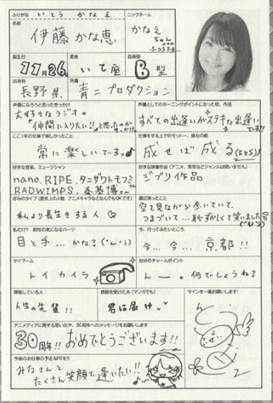 粉絲們一定就比較少接觸到了吧,剛好最近二期的日本動漫雜誌Anime Media附贈了二本小冊子,一本是100位女性聲優的基本資料、一本是男性版的,所以說趁這個機會,可以跟粉絲們介紹一下幾個有可愛簽名的聲優囉。